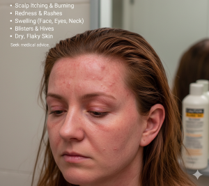 Hair dye allergy symptoms typically appear within 24 to 72 hours after application in previously sensitized individuals. The most common signs include intense itching of the scalp, redness and swelling around the hairline, forehead, eyelids, ears, and neck. Many people experience burning or stinging sensations, blistering, dry and cracked skin, and in severe cases, symptoms can escalate to hives, throat tightness, difficulty breathing, and even anaphylaxis.​